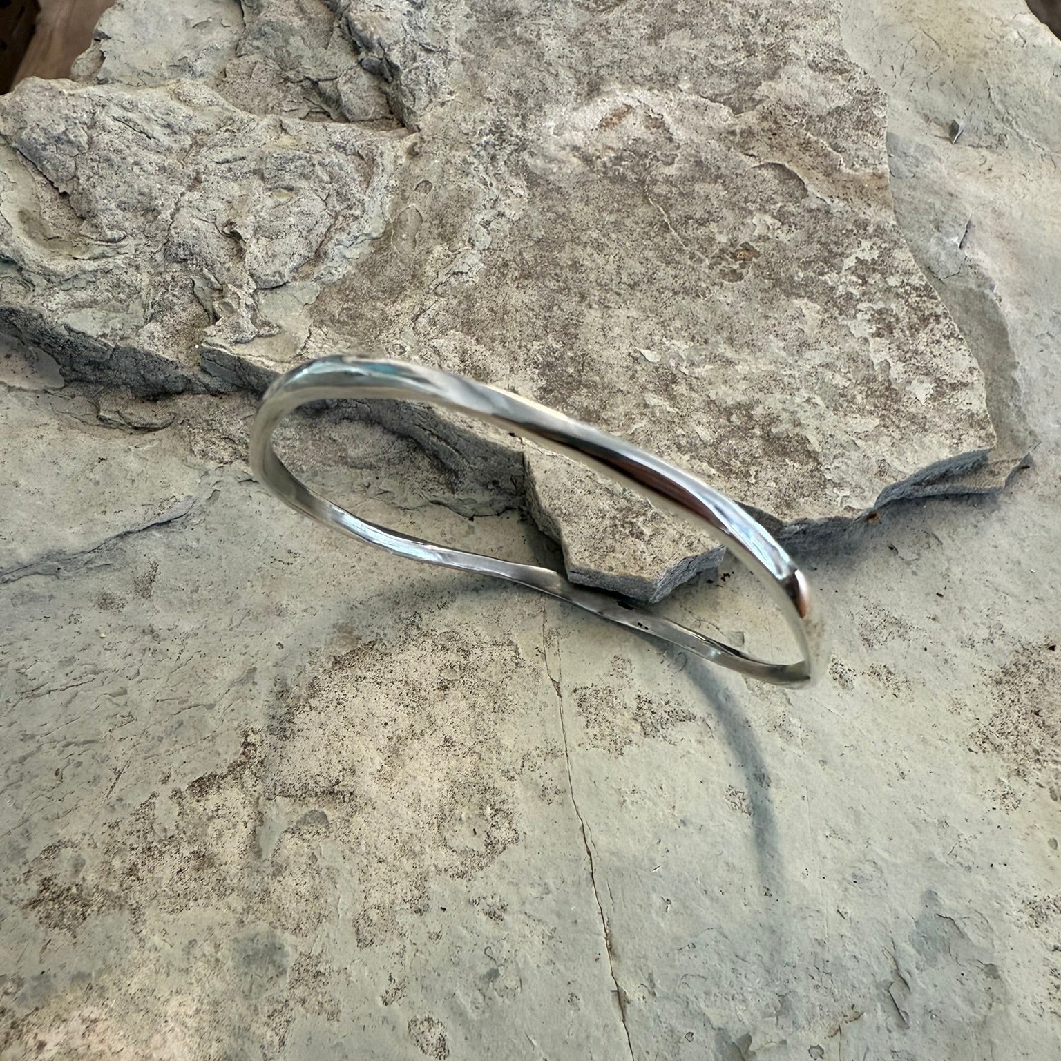 Hand-forged sterling silver bangle with a textured surface inspired by the movement of water. Medium weight for a luxurious feel.
