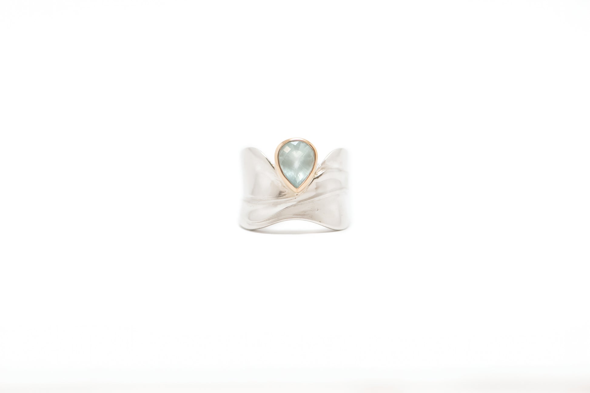 Silver Escarpment ring featuring a 1.42ct pear Aquamarine set in 14k yellow gold